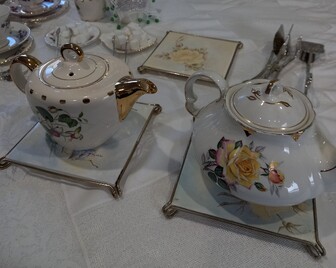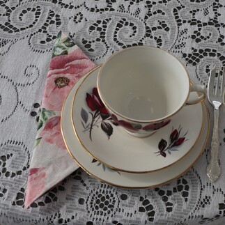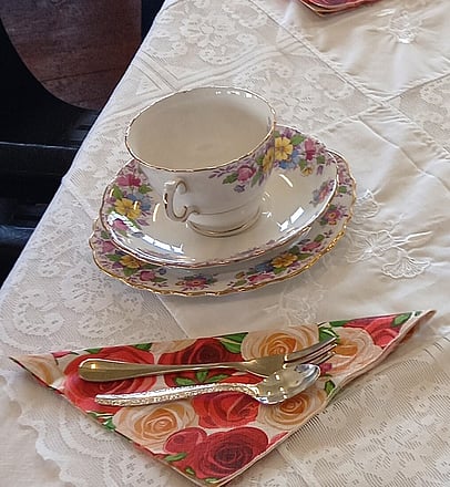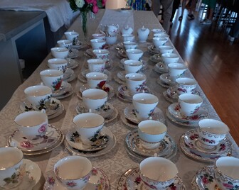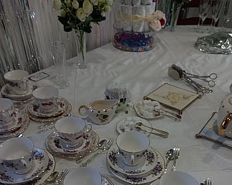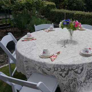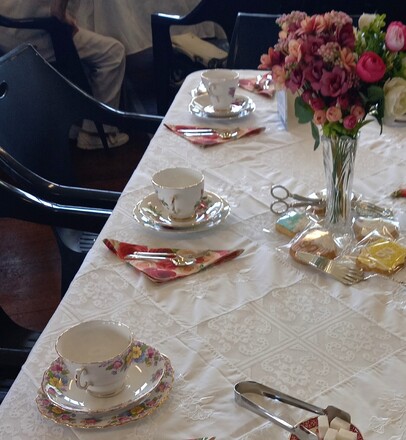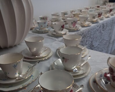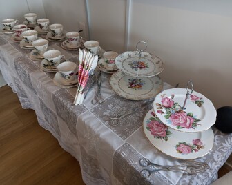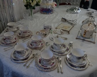The client used some of their own cake stands and catered their own afternoon tea. All Occasions provided the party hire & high tea accessories: trios (cups/saucers/plates), 3-tier cake stands, china teapots and tablecloths, with out-of-town delivery and pickup - hired and delivered for one inclusive price. Wow, look at those tablecloths - supplied by All Occasions, as part of an all inclusive package deal.