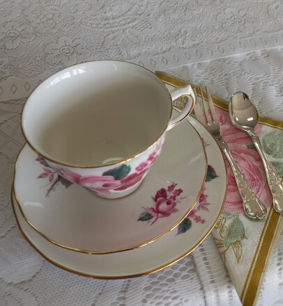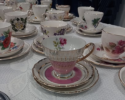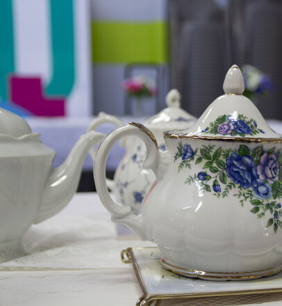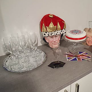 A client's event, celebrating the King's Coronation, while also raising money for Pink Ribbon Breast Cancer. Complete with a "Charlie's corner", a beautiful cake and British teapot as well as other china from our hire collection.